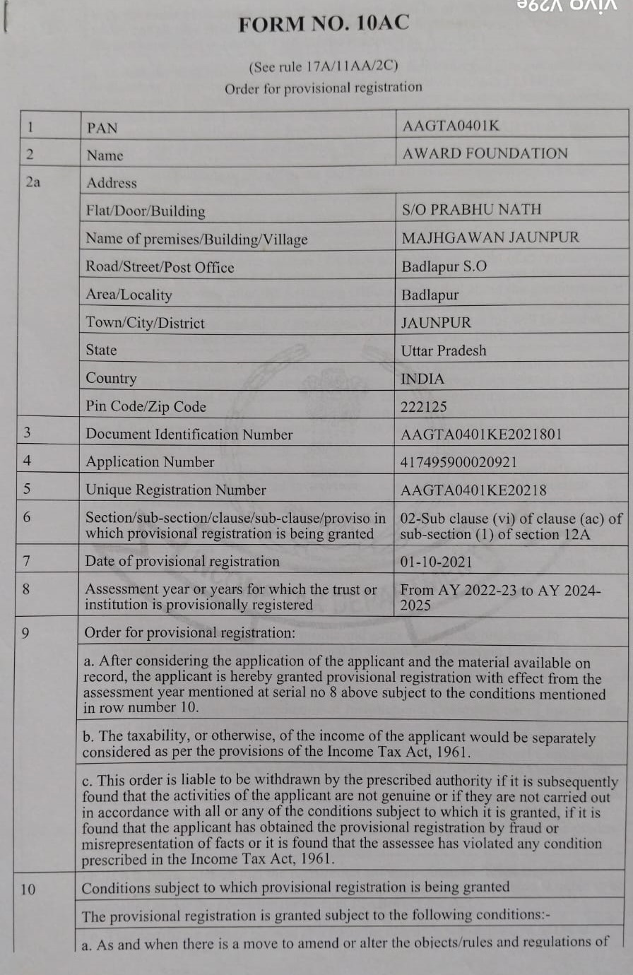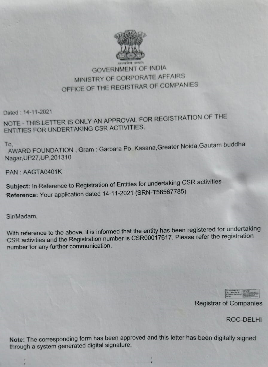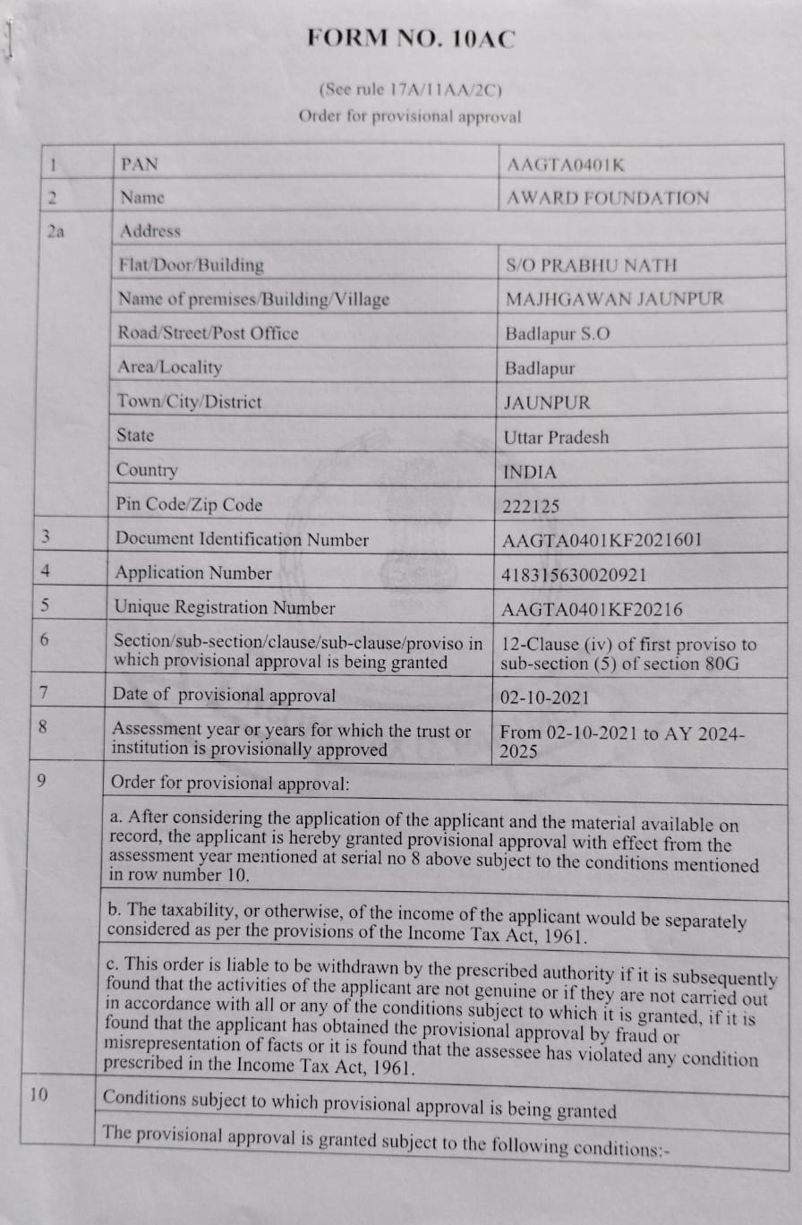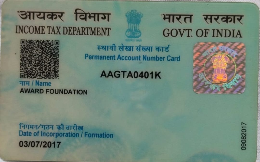 Document Gallery Award Foundation Registration PAN Card 12A Registration 80G Registration AWARD FOUNDATION MSME Foundation Darpan